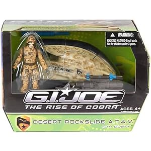 Product Description : DESERT ROCKSLIDE AllTerrain Attack Vehicles (A.T.A.V.s) patrol the desert, looking for COBRA* troopers who dare to approach the G.I. JOE PIT HEADQUARTERS*. These ultra light A.T.A.V.s cruise over dunes and rocky desert ground with IDW4 front and rear suspension and an 860cc liquidcooled engine. If intruders get too close, the A.T.A.V.s head toward them, missiles armed and ready to fire!Stage your own desert assaults in the ongoing fight of the G.I. JOE team versus COBRA forces. This awesome desert patrol vehicle features turning front skis, pivoting treads and firing missiles for tracking down enemies in tough desert climates or your living room. Pose the included DUSTY action figure at the controls and see if you two can make todays mission a resounding success!Vehicle comes with DUSTY figure.