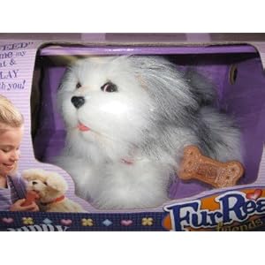 Product Description : This is 10" long fluffy white and gray long hair puppy that moves his front feet up and down and barks as his head moves up and down. An adoption certificate and bone are included. Batteries required.